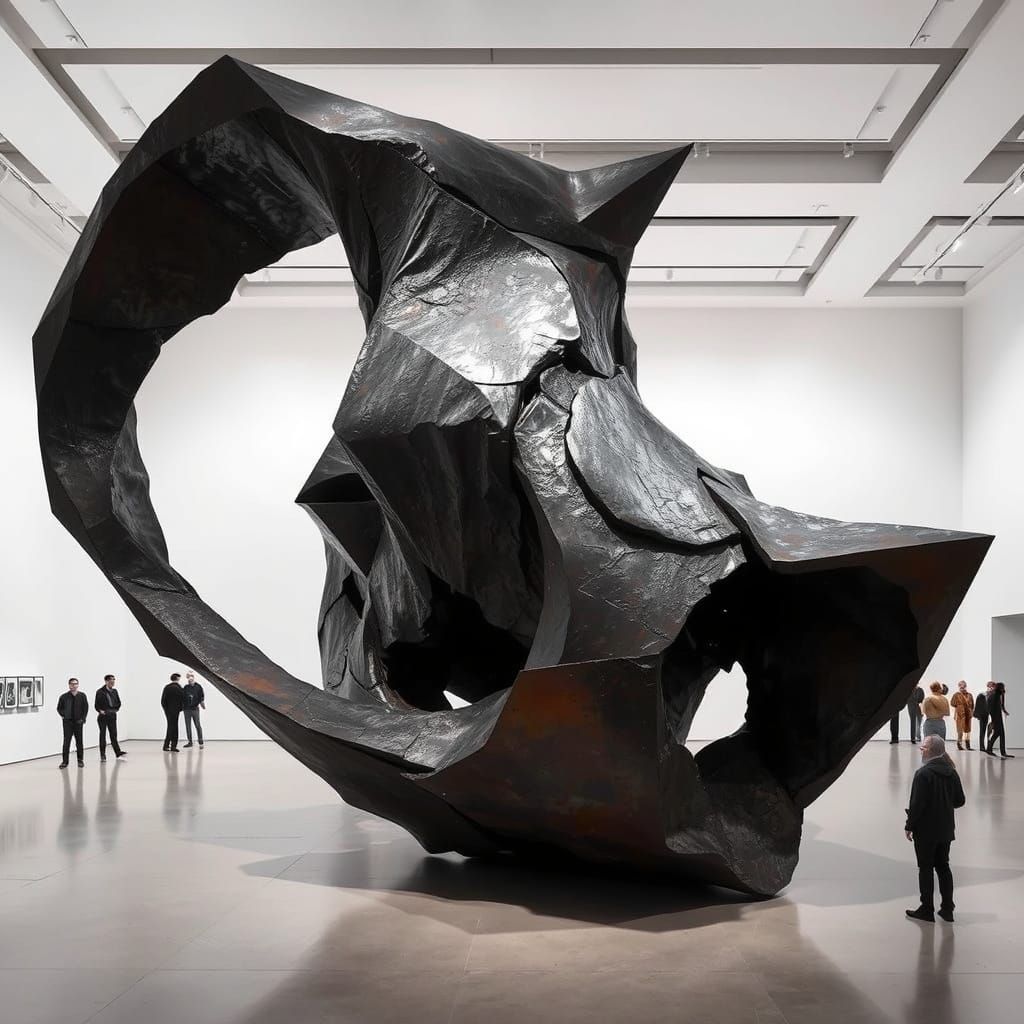 **"Echoes of the Abyss"** white gallery space with people. A very large jagged, brooding abstract sculpture in oxidized steel and shadowed bronze. Twisting planes fracture into smooth curves, textured with deep grooves and a rough patina. Hollow voids and sharp angles create a sense of looming tension, ...