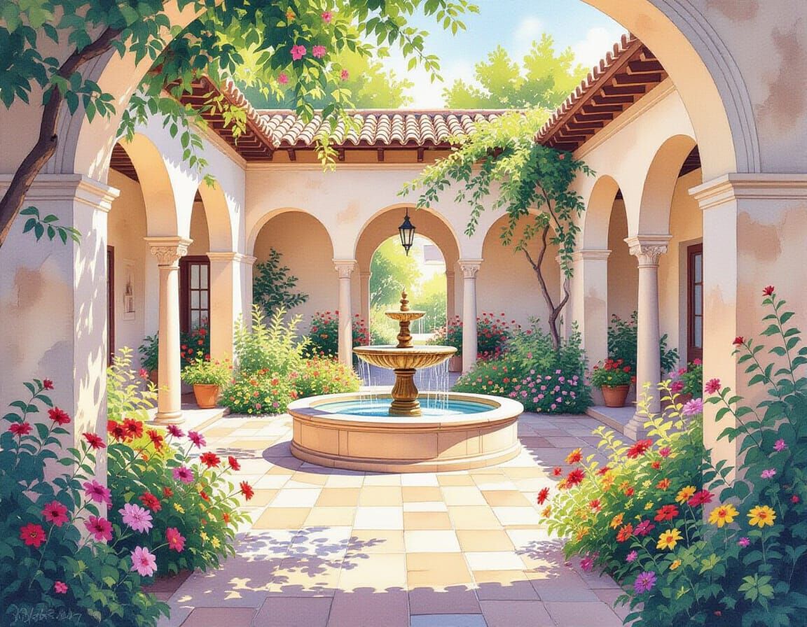 This image shows a serene watercolor painting of a sun-drenched courtyard garden. It features vibrant flowers, lush greenery, and arched walkways surrounding a central stone basin, evoking a sense of calm.