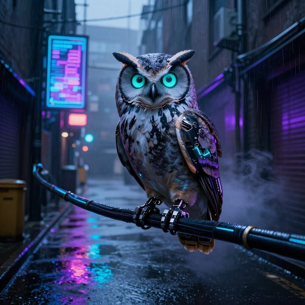 A hyperrealistic image of a sophisticated robotic owl on a neon data cable in a rain-slicked alleyway. Holographic ads reflect on wet streets, with moody blue and purple tones creating a gritty, cinematic atmosphere.