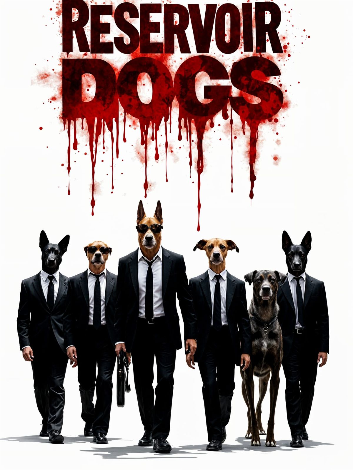 A photorealistic reimagining of the Reservoir Dogs movie poster, featuring six different dog breeds dressed as the main characters against a white background with red blood splatter. Stylized and cinematic with a humorous twist.