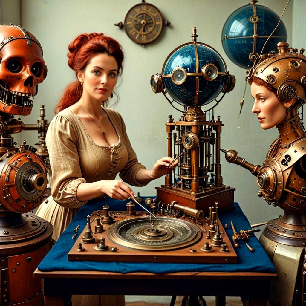 highly expressive full-body shot of charming charismatic 38-year-old lady fixing fantastic ancient scientific instruments, expressive intelligent eyes, effortless confidence, engaging expression, happy contented feel; professional photography by Alessio Albi, Anya Anti, Rosie Hardy, Nathaniel Goldberg, ...