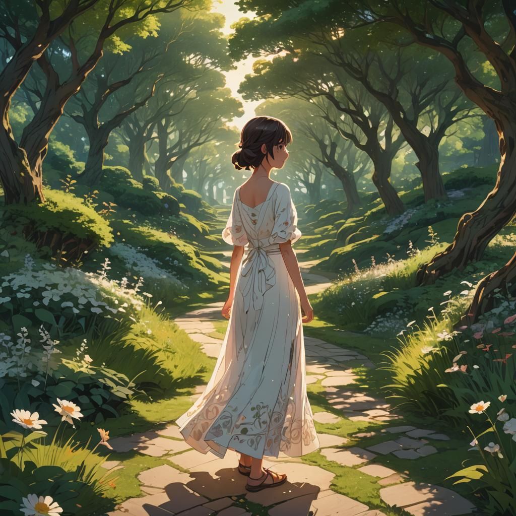 A cinematic image of a woman at a crossroads, deciding between two paths. The scene is bathed in the warm light of the setting sun, rendered as detailed 3D anime art.
