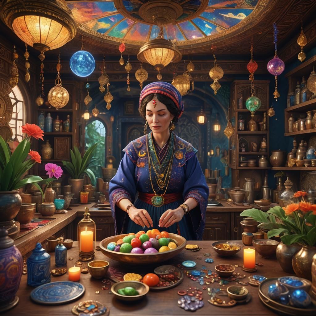 A Klimt-inspired fortune teller in a tropical kitchen. The scene is a detailed matte painting with deep, complementary colors, presented as fantastical concept art in 8k resolution.