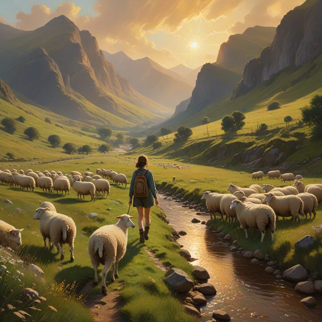 This image shows a teenage girl walking through a serene valley filled with sheep. Soft brushstrokes and warm golden light create a peaceful atmosphere in this landscape orientation oil painting.