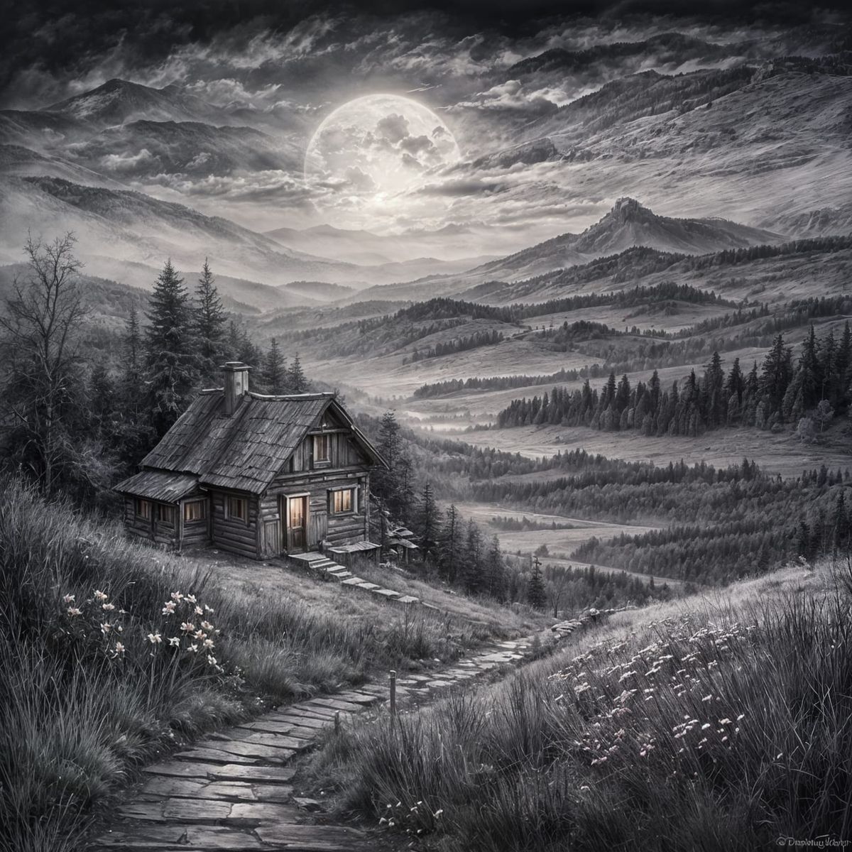 This image shows a serene Ukrainian landscape at dusk. A traditional Hutsul cottage sits on a hillside with a stone path leading to it. A river reflects the sunset, and a large moon rises over the mist-shrouded mountains, rendered as a hyperdetailed charcoal drawing.
