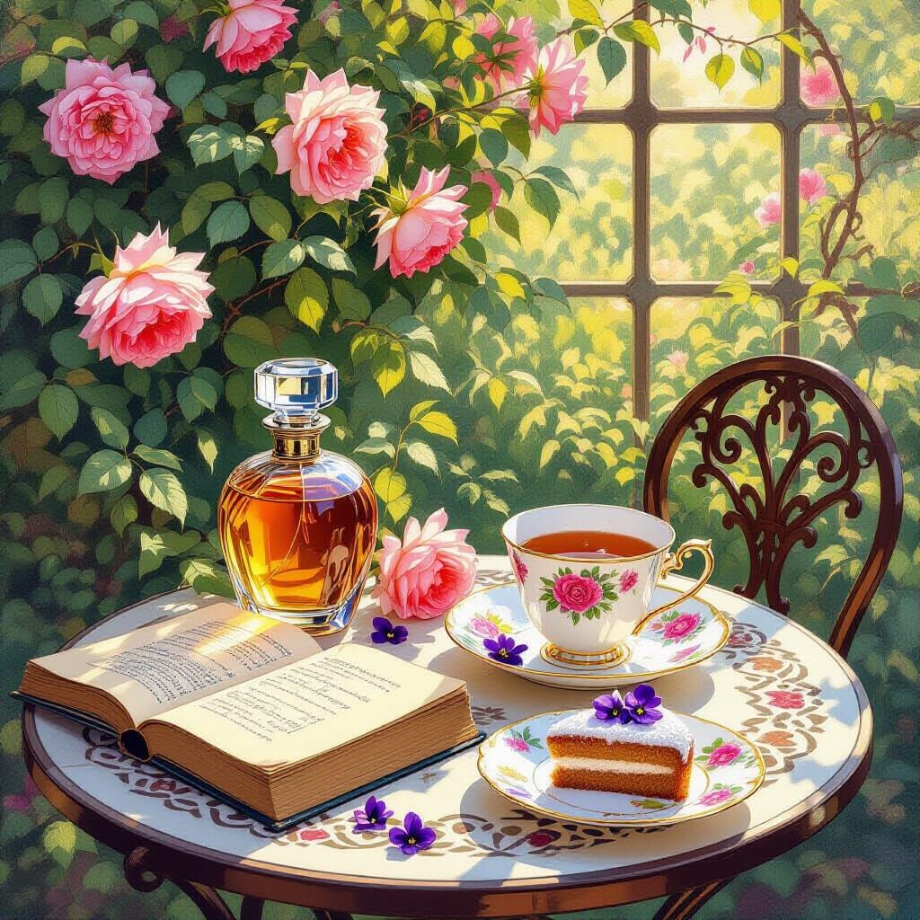 This image depicts a charming Art Nouveau scene on a garden table. It features a perfume bottle, book, teacup, and cake, set amidst climbing roses under dappled sunlight.