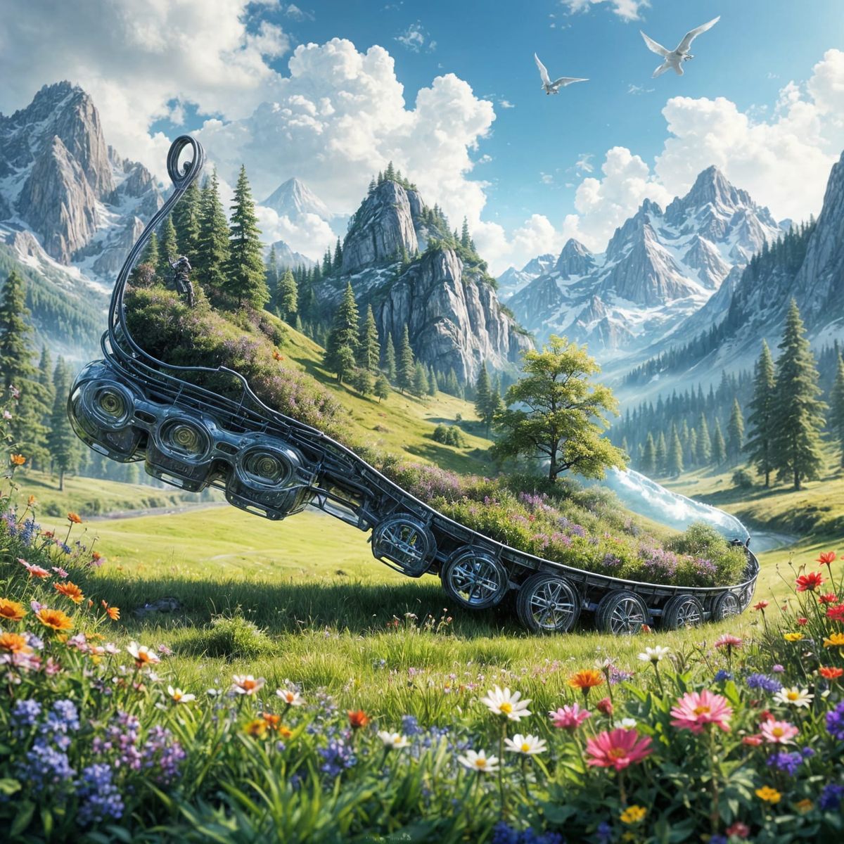 This image showcases a clear glass athletic shoe containing a detailed mountain panorama and a vibrant golf course scene. The artwork blends realism with fantastical elements for a dynamic composition.