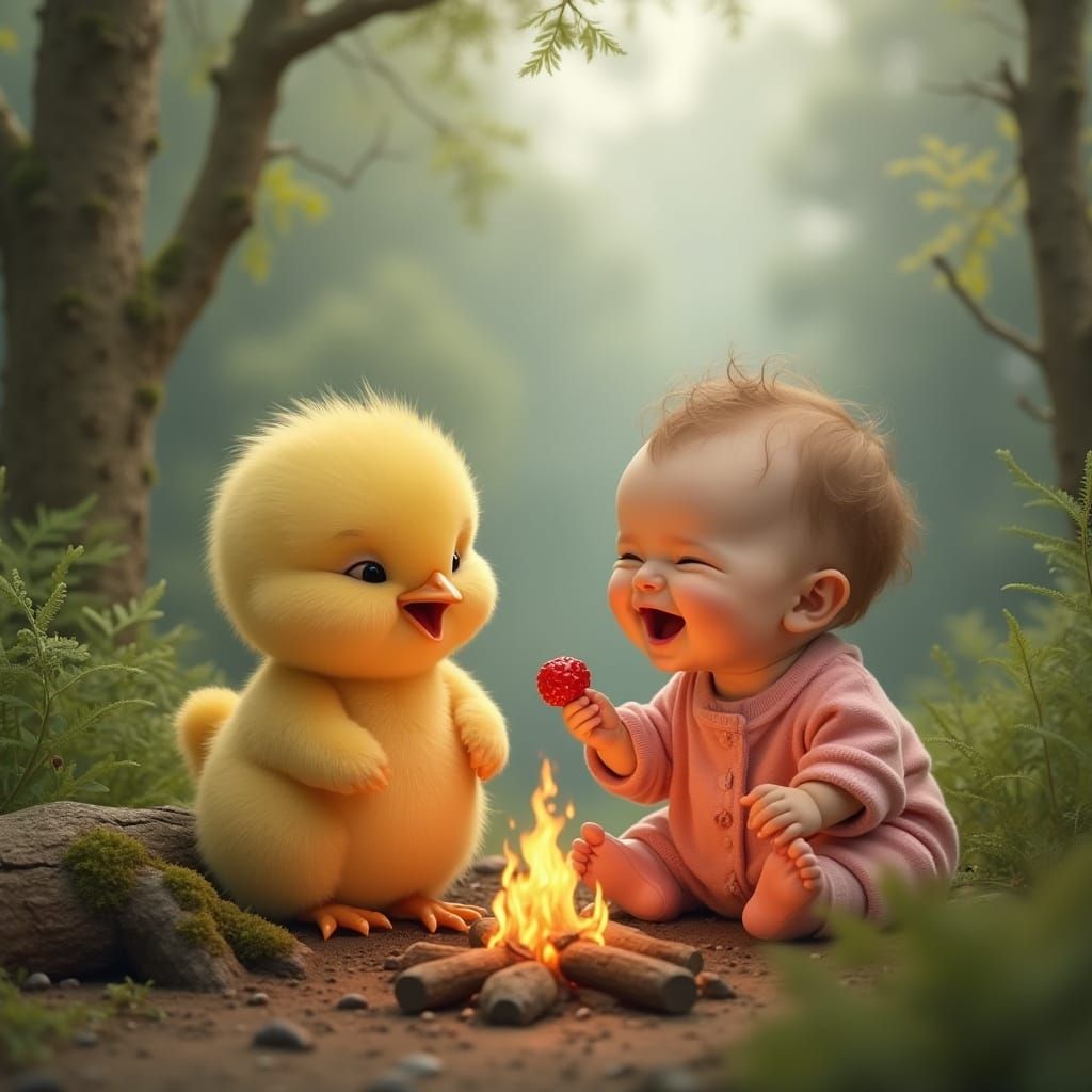 This image shows a fluffy yellow chick in a onesie offering a red berry to a laughing baby near a campfire. It features photorealistic details and a vibrant, lush forest backdrop.
