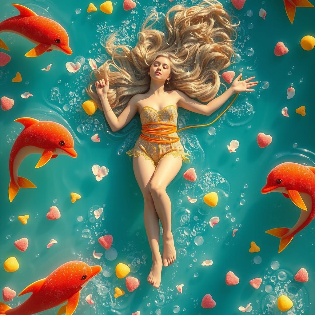 A surreal image of a golden-haired woman floating on soda. Gummy candy dolphins surround her in a dreamlike setting with citrus threads, rendered in vibrant colors reminiscent of surrealist art.