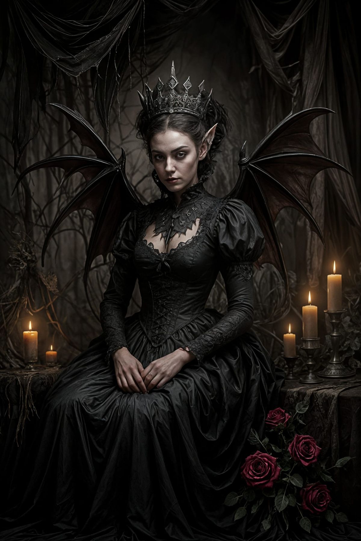 A surreal, hyperdetailed image of a Victorian queen vampire with tattered bat wings, sitting in a dark, rustic lair adorned with flowing fabrics and candles. Rendered in a dark fantasy, photorealistic style with subtle gray, black, and red tones.