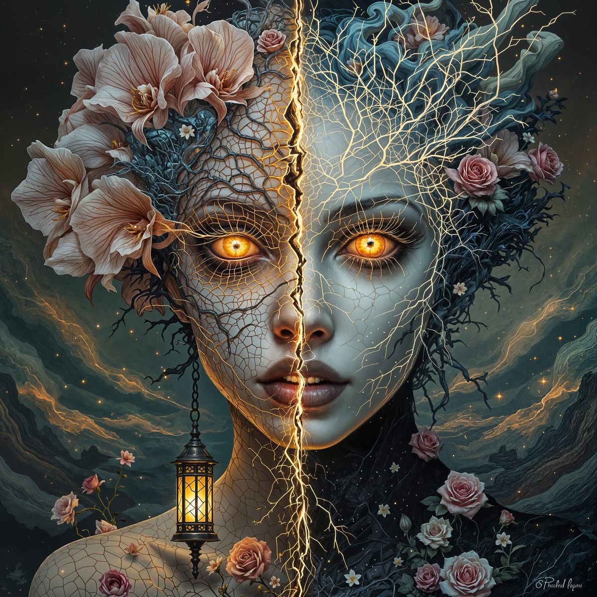 This image is a hyper-detailed, surreal portrait of an anthropomorphic orchid, blending beauty and intensity in a complex, chaotic landscape of swirling patterns and vivid hues.