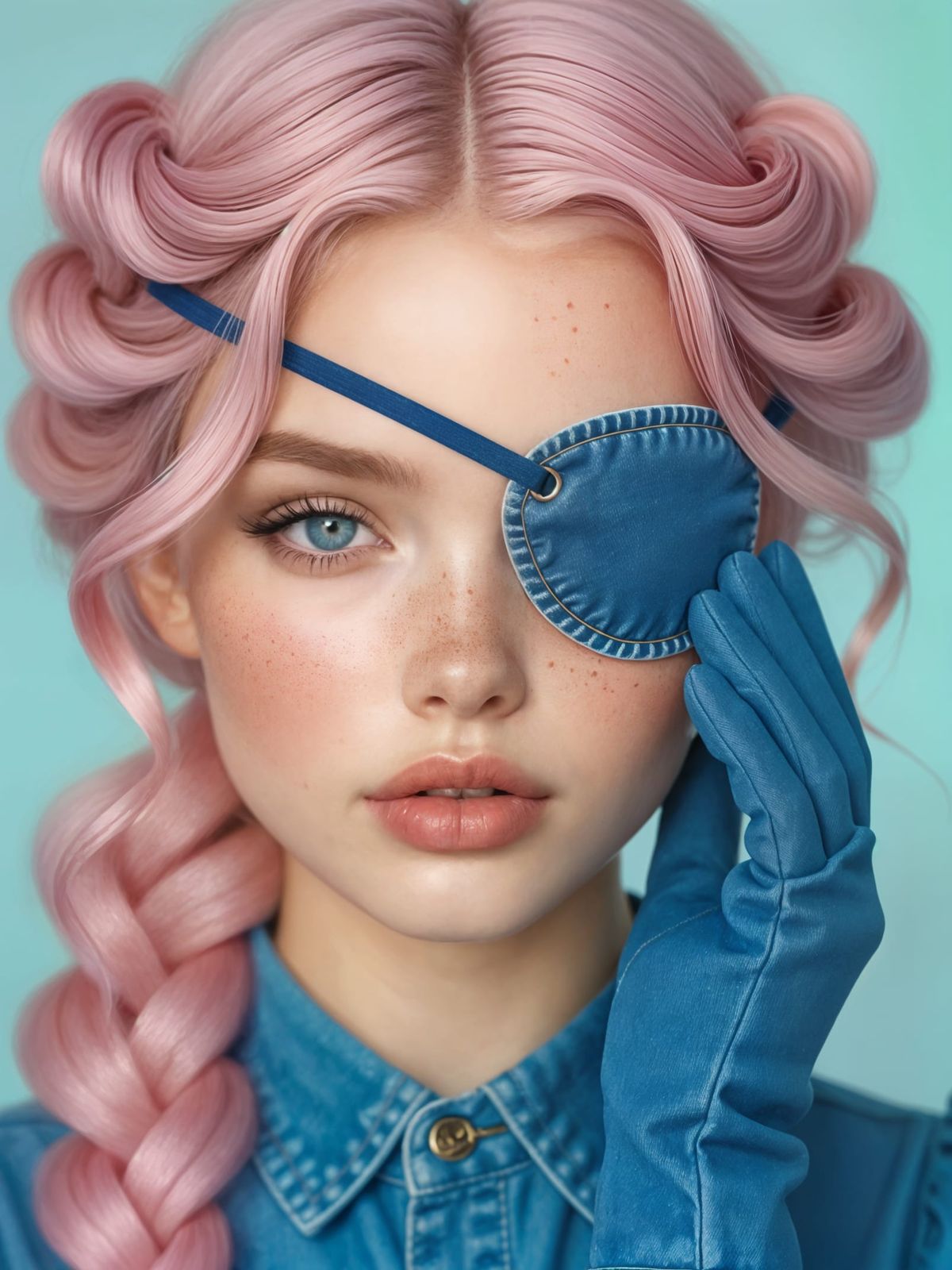 Photorealistic fantasy portrait of a gorgeous young woman with pink hair and a denim eyepatch. Soft backlight and subtle shading create a divine glow.