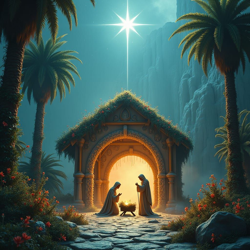 A vibrant Nativity scene with the three wise men on camels approaching the stable under a guiding star. The image evokes a mystical and dreamlike atmosphere in a surreal, high-contrast digital art style.