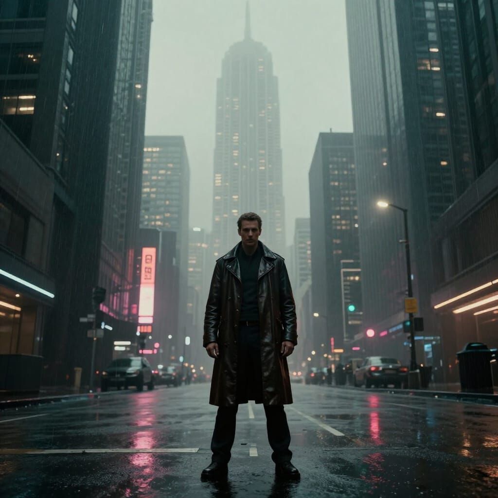 This image shows a lone person in a duster coat on a wet, neon street with futuristic skyscrapers. It features dramatic lighting and a muted palette, evoking film noir.