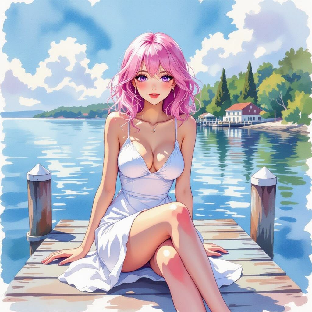 A woman with pink hair and violet eyes sits on a dock in a white dress. Rendered in a vibrant gouache and watercolor style with thick, textured brush strokes.