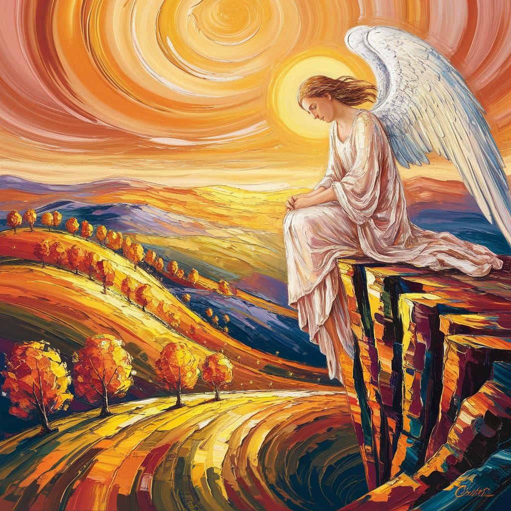 This expressionist painting shows a luminous angel in ivory robes on a cliff, overlooking a warm landscape with rolling hills. Features bold brushstrokes and impasto textures.