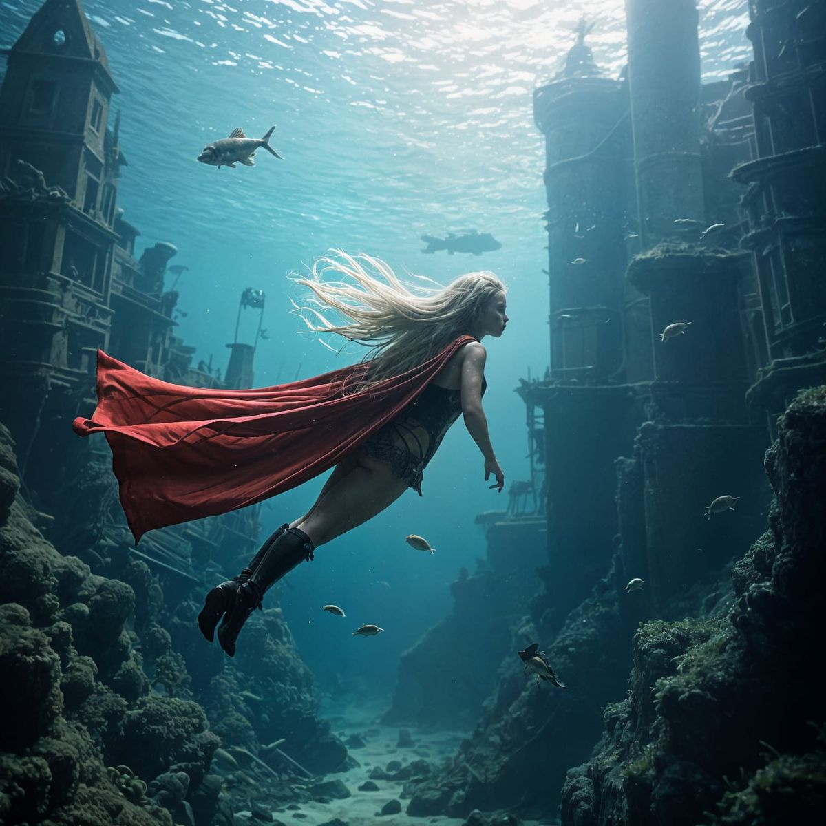 A captivating image of a silver-haired super-girl gracefully swimming through the ruins of a sunken city. Exotic fish populate the background in this highly detailed, 8k resolution underwater scene.