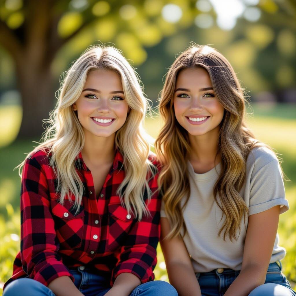 This image shows two young women sitting together in a sunlit park. Captured with a cinematic film aesthetic, featuring soft light and shallow depth of field.