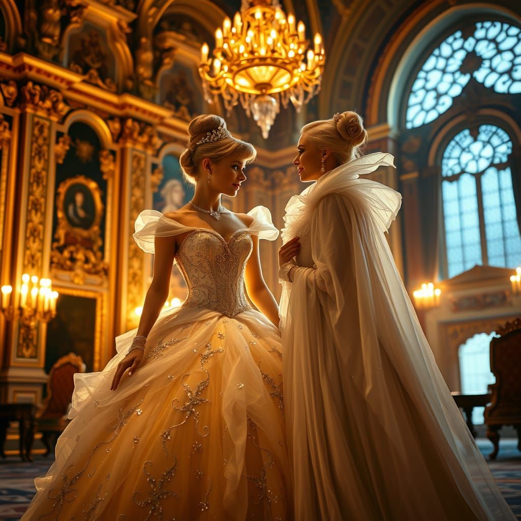 This enchanting image depicts Cinderella and her fairy godmother amidst a lavish, Baroque-inspired ballroom, with delicate lighting and intricate details, reminiscent of epic cinematography and masterful digital artistry.