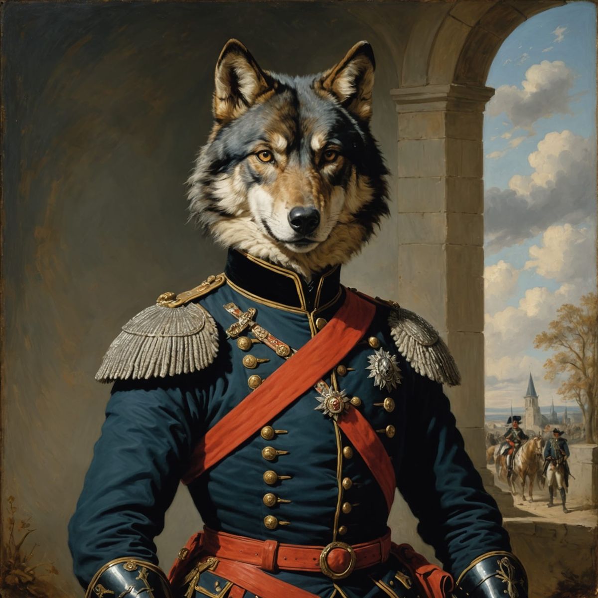 This AI-generated image depicts a wolf dressed as a French Hussar, complete with a distinctive bearskin hat. The portrait captures a unique military-themed character.