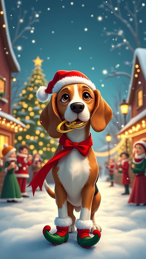 This image shows a charming beagle in a Santa hat, victorious with a golden ribbon in a snowy village. Rendered in a vibrant cartoon style with festive colors.