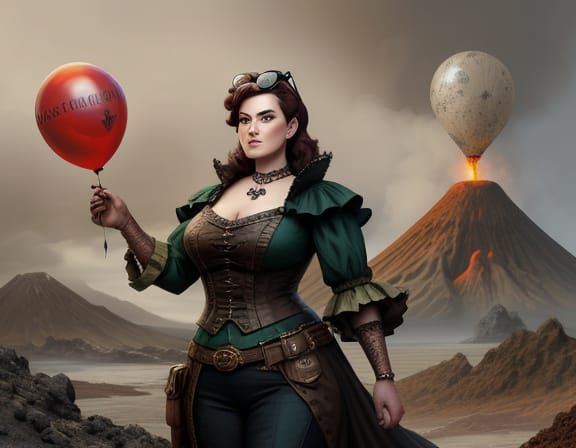 A sepia illustration of a plus-sized steampunk kobold near a volcano. She wears modest clothing and holds a balloon. The artwork evokes graphite and charcoal drawings.