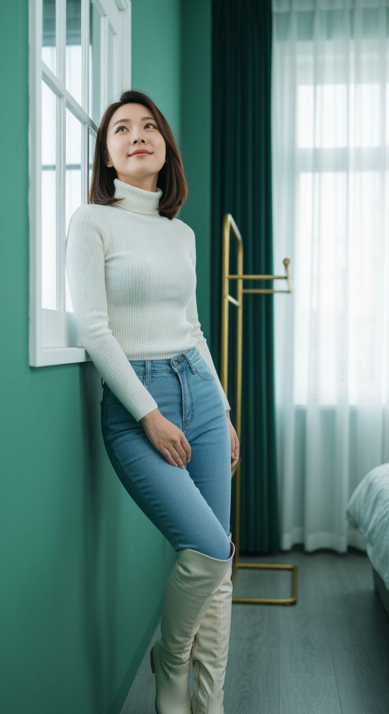 This image shows a young Asian woman in casual fashion against a teal wall. The serene studio portrait features soft, even lighting and a muted color palette with a soft, romantic atmosphere.