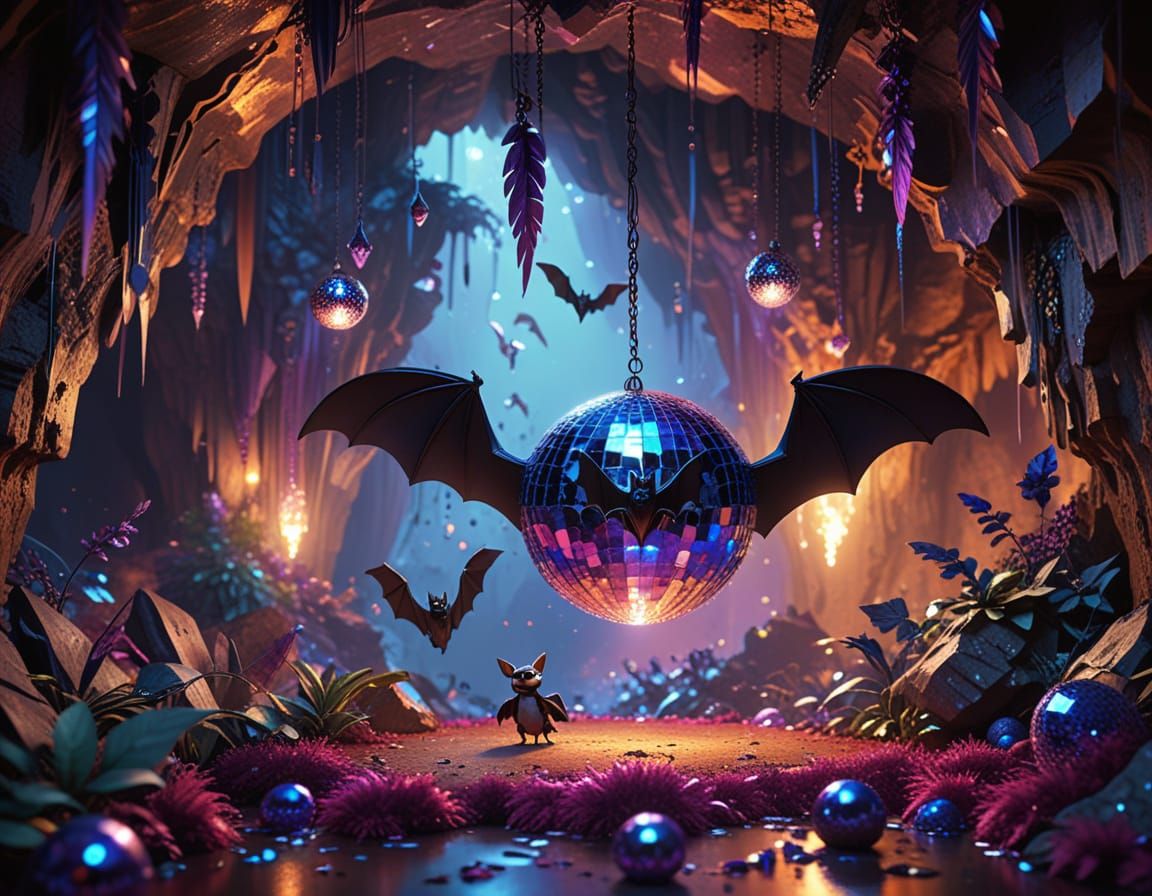 A colorful 3D digital art piece featuring bats in sequined costumes and a mirrored disco ball in a large cavernous space, reflecting bright lights and colors