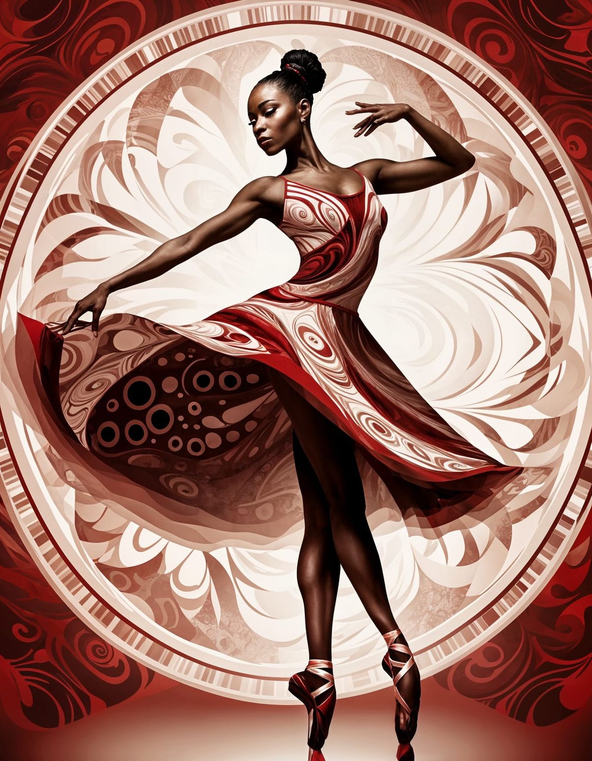 This image shows an African American ballet dancer in a unique Fractal Jazz style, featuring recursive patterns in crimson and cream that capture the spirit of jazz improvisation.