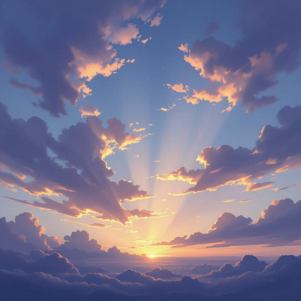 This image captures the vast Almelo sky at dusk, featuring layered clouds in lavender, rose gold, and indigo with dramatic light shafts. Rendered in a painterly, atmospheric style with luminous light and rich color gradients.