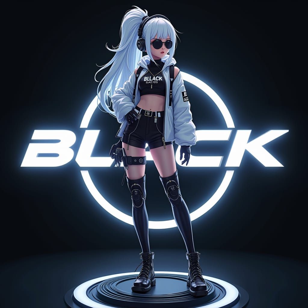 A full-body anime-style portrait of a confident sci-fi warrior woman. She stands in a glowing circle on a futuristic speaker, with neon accents and typography, in a dynamic, high-contrast anime aesthetic.