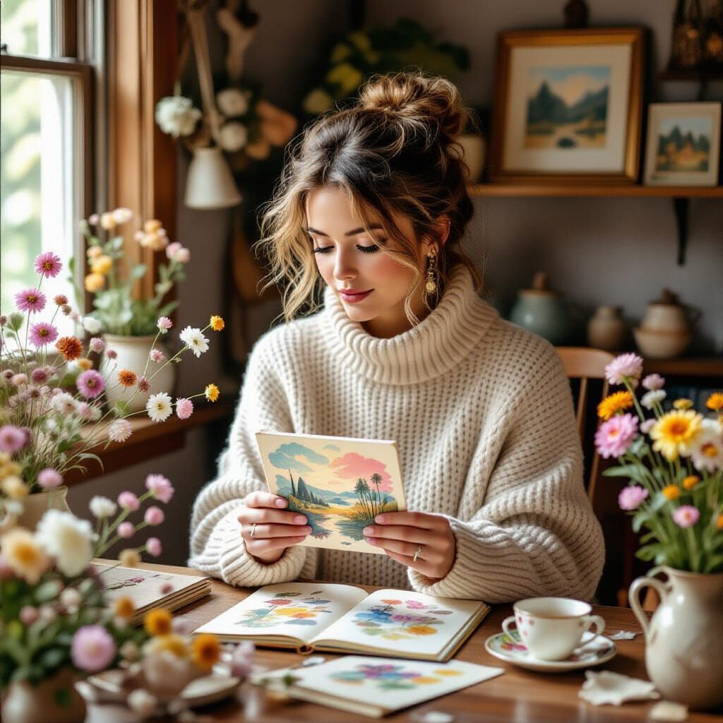 This image shows a woman in a cozy room filled with dried flowers and vintage photos, illuminated by a glowing travel journal. The scene is rendered with soft colors and dreamy textures, reminiscent of classic watercolor illustrations.