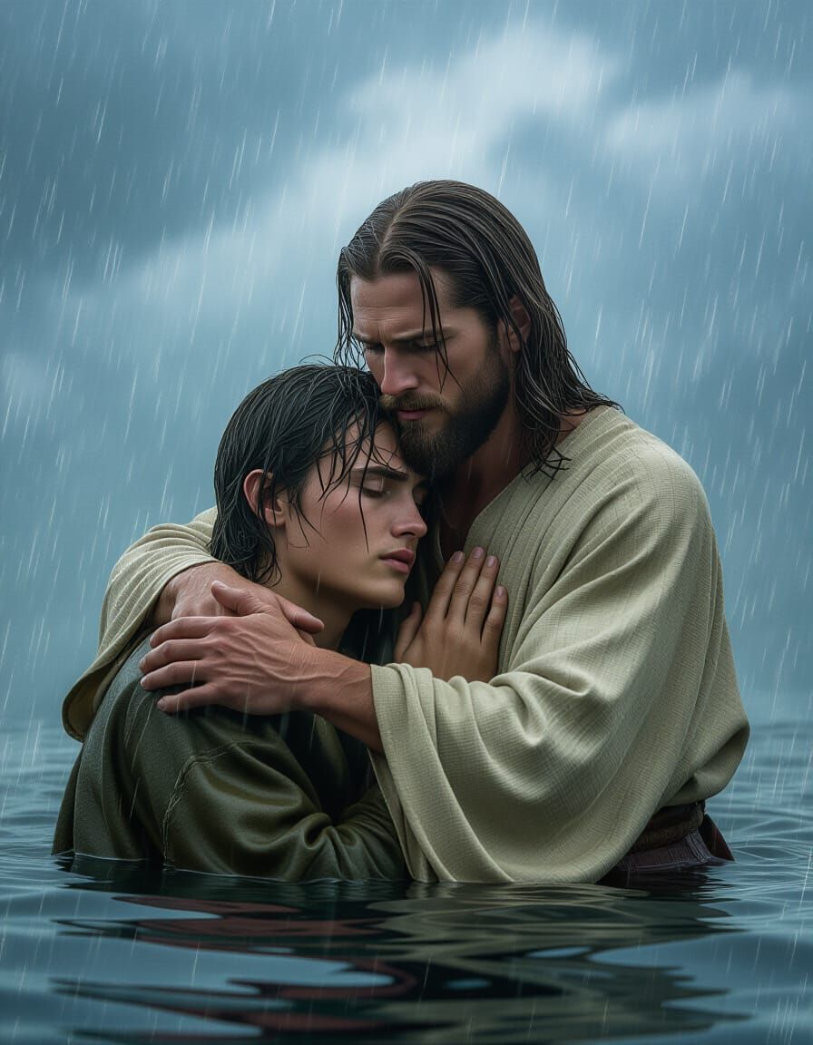 This image shows Jesus embracing a young man in a storm. The scene is rendered with dramatic lighting and intricate details, creating a cinematic and atmospheric digital painting.