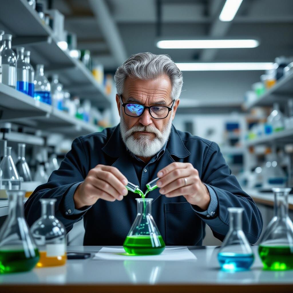 This image shows an elderly chemist with curly grey hair and a beard conducting a science experiment in his lab. He is pouring green liquid between test tubes, surrounded by equipment.