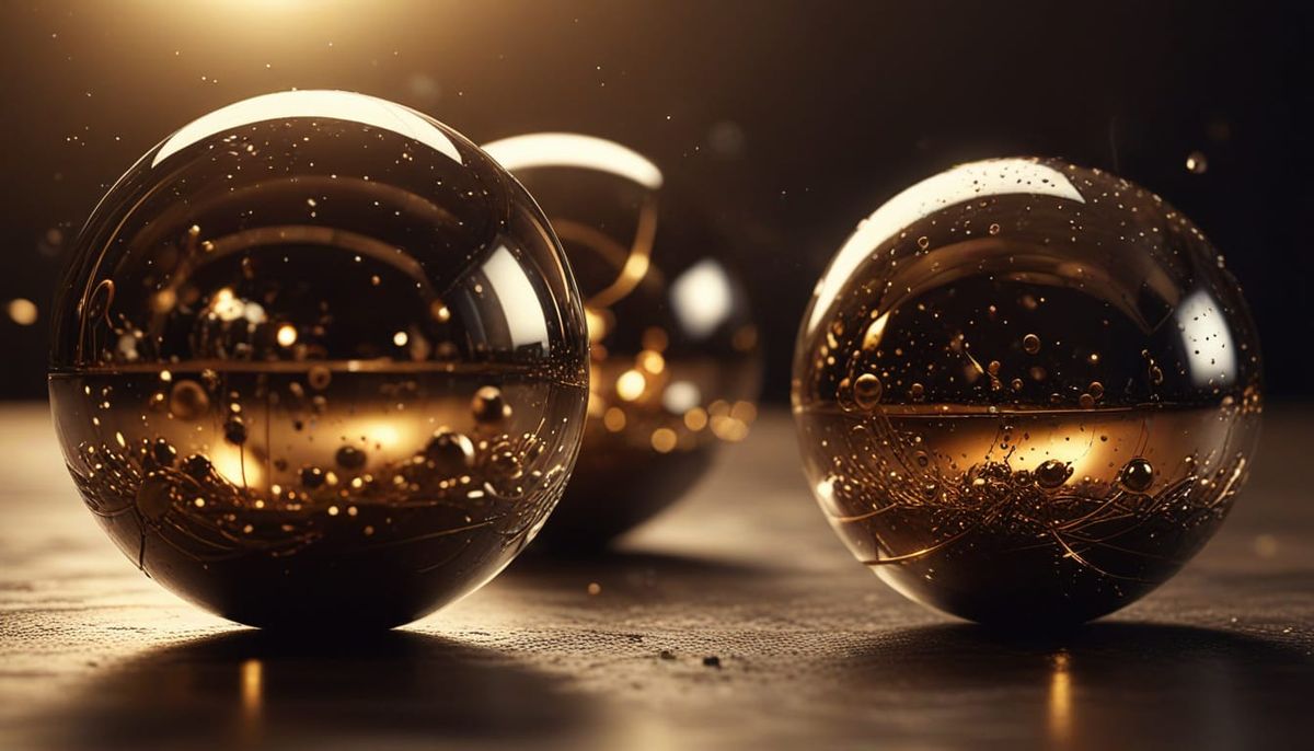 This image shows delicate, glowing musical spheres suspended in mid-air, set against a dark, atmospheric background with golden hour lighting and intricate metallic details.