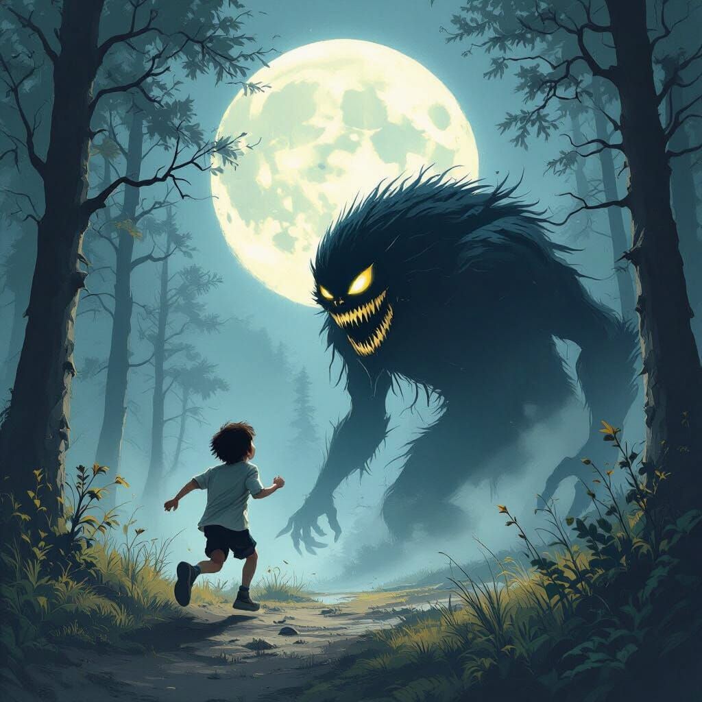 This image shows a terrified village boy named Jono fleeing through a moonlit forest. A large, hairless, black figure with sharp teeth pursues him in a dark, gothic noir style.