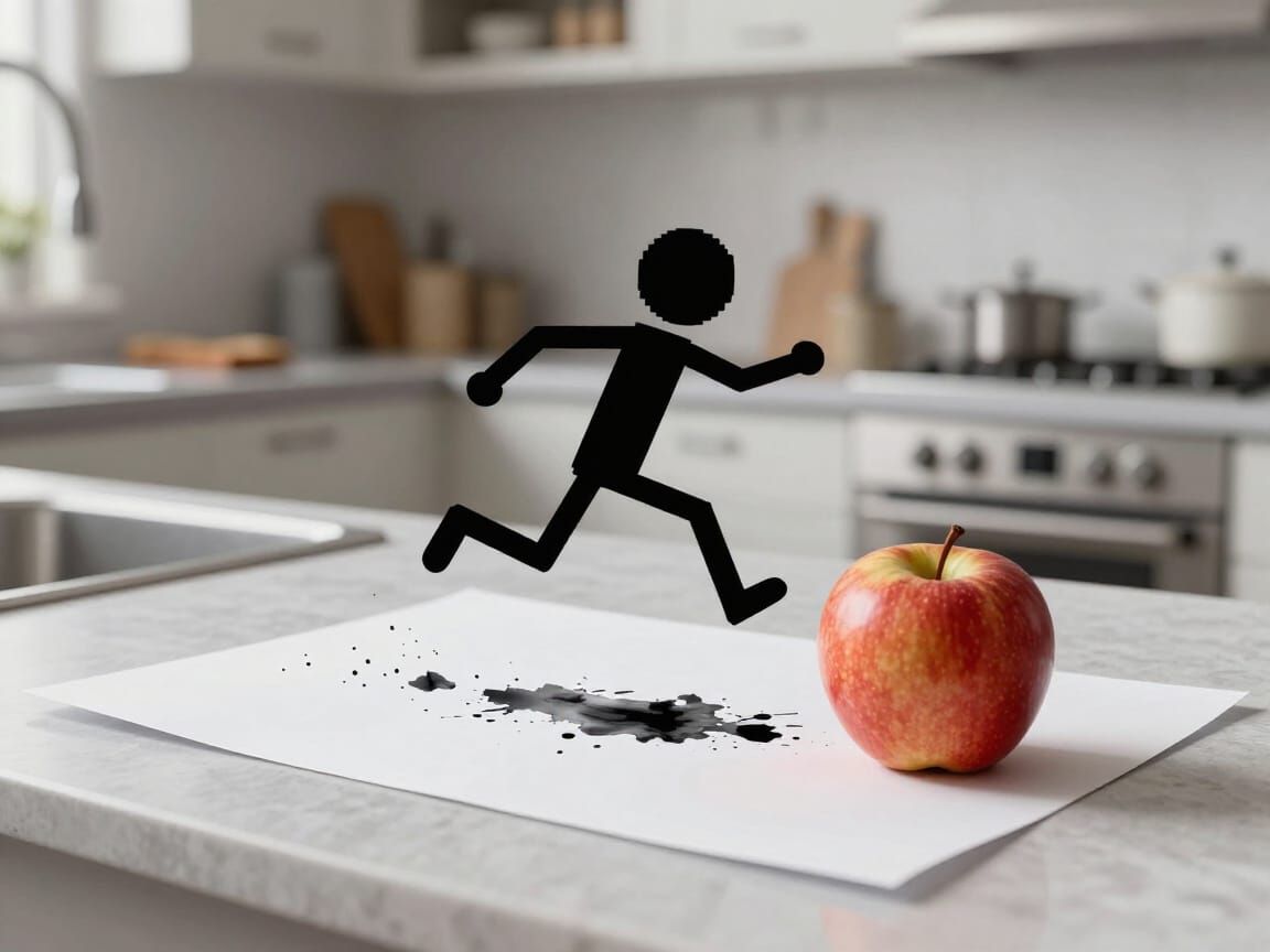 This image shows a detailed 3D scene with a 2D ink stick figure peeling off paper and leaping over an apple on a kitchen counter, blending pixel art with realism.