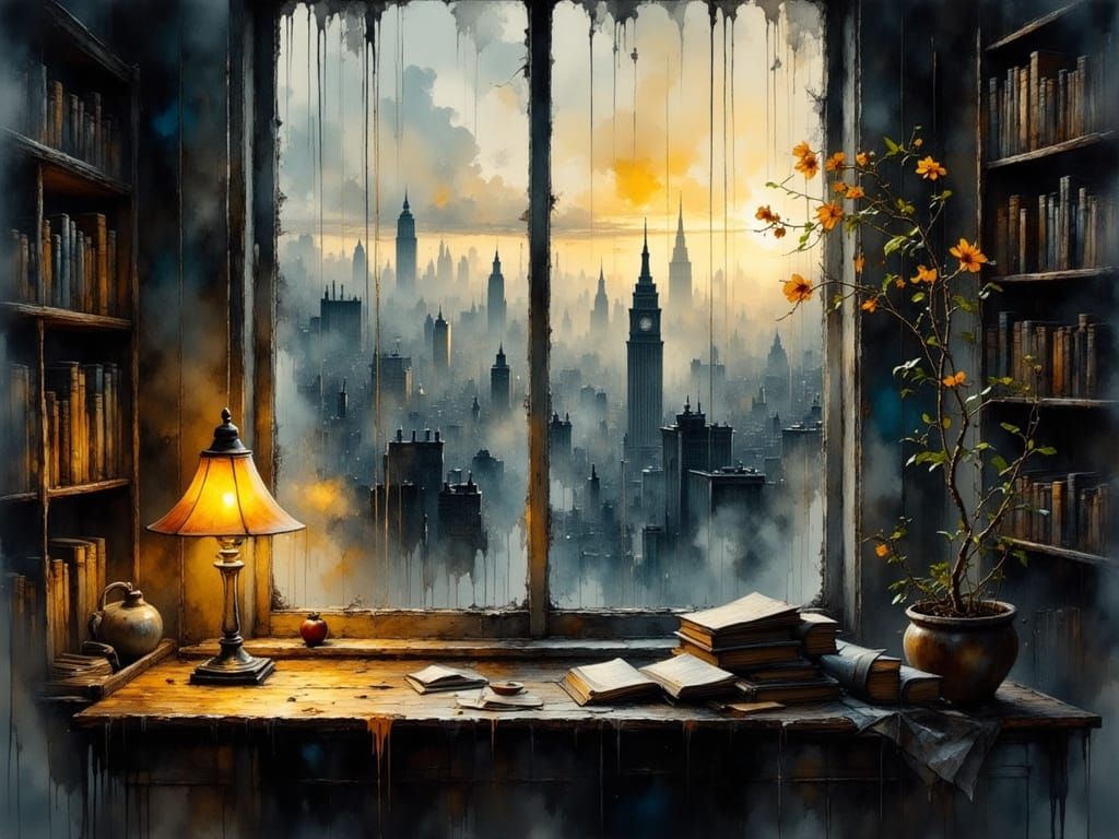 This impressionistic watercolor captures a city skyline at twilight through a rain-streaked window. Muted colors and loose brushstrokes create a melancholic, introspective mood.