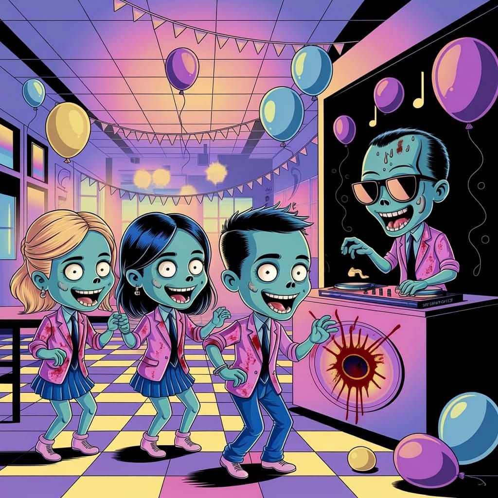 Chibi Zombie teenagers dancing in a cafeteria of a school, they are all grinning and drooling happily, one's arm is hanging from their body while another one has an eye popped out of the socket, the cafeteria is decorated for prom, pearlescent, purple and blue balloons and streamers are everywhere, an ...