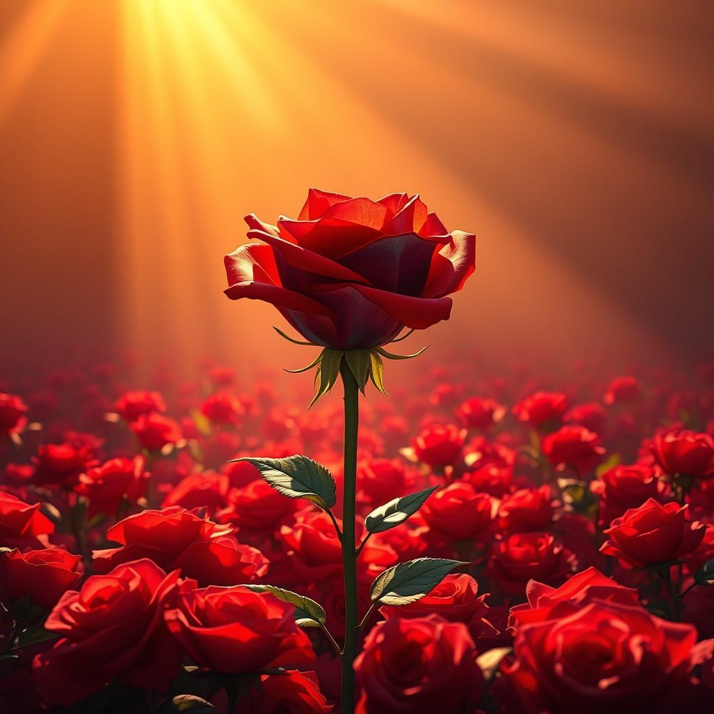 This image showcases a majestic, high-contrast rose blooming in a sea of red roses, set against a warm, golden light, with intricate details and dynamic volumetric lighting, evoking a sense of wonder and awe