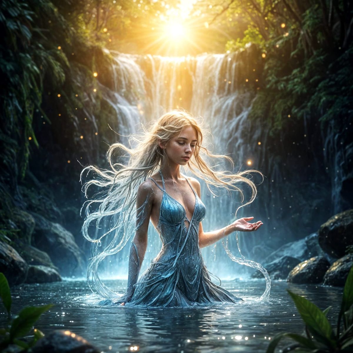 image of a realistic , Generate an image showcasing a delicate water spirit, image in a fantasy style. This spirit is completely formed from glistening dew droplets. immersed in the soft at the end of a waterfall, golden light of the rising sun. The entire scene promotes a sense of peace and wonder, ...