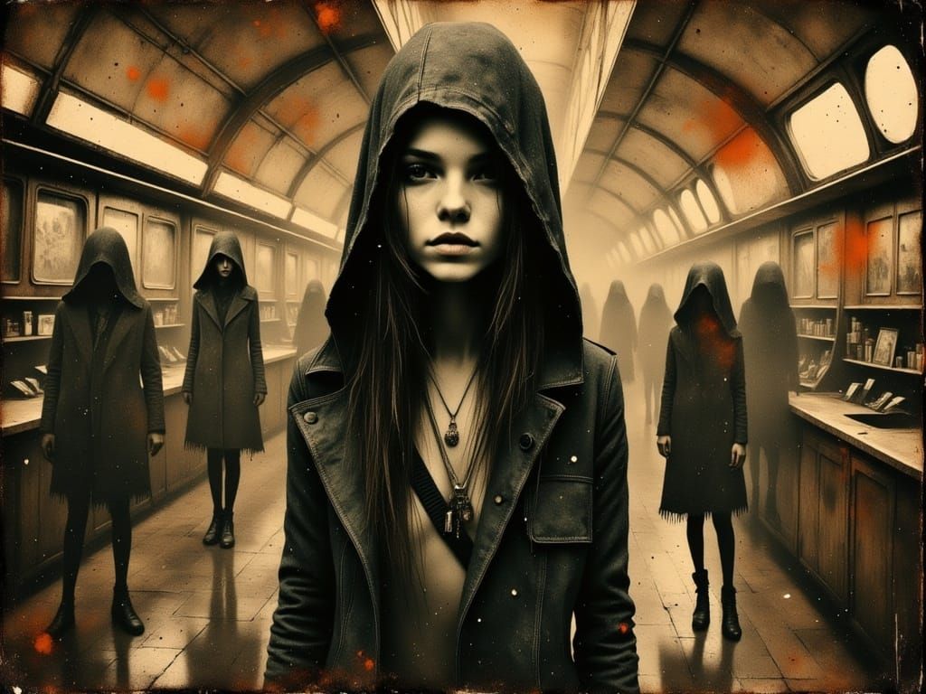A sepia-toned, high-definition image of Malika Andrews as an explorer inside a detailed submariner's vessel. Dramatic lighting and rich depth of field create a sense of adventure in this oil painting style.