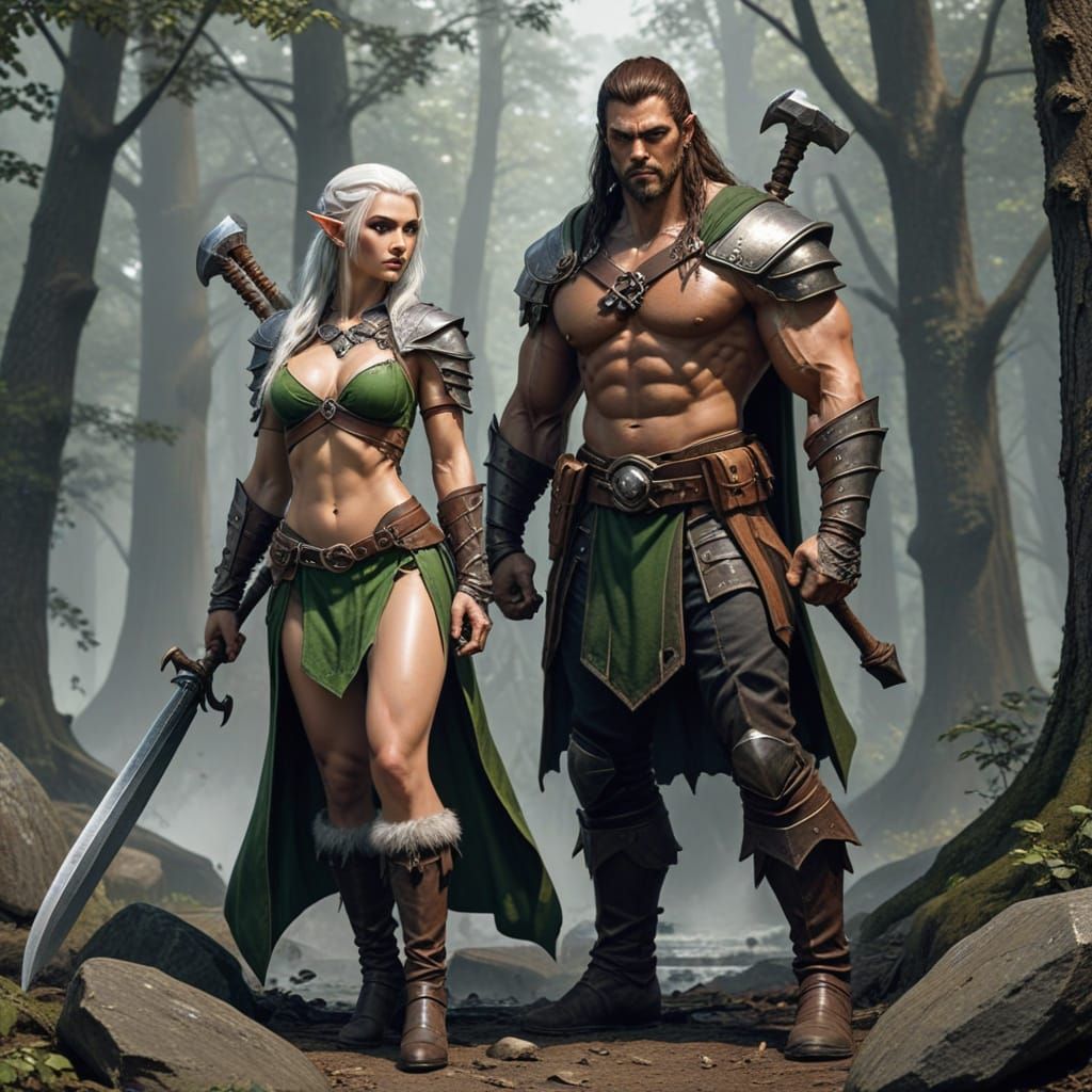 This image shows a female elf rogue standing with a tall, muscular human warrior holding an axe. It depicts a classic fantasy pairing of characters.