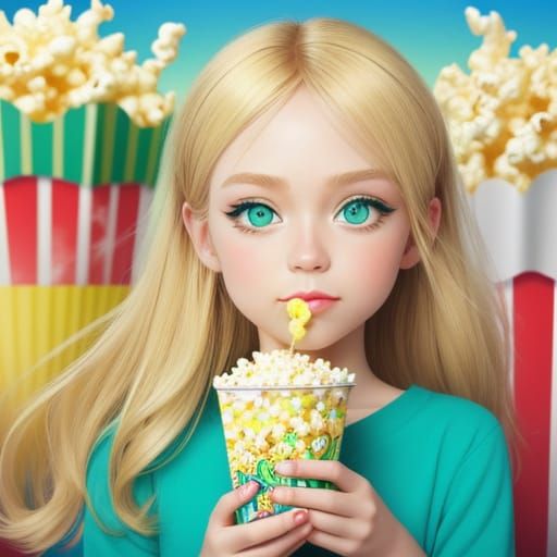 This image features a young blonde girl with striking green eyes, enjoying a snack of vibrant popcorn while situated by the ocean.