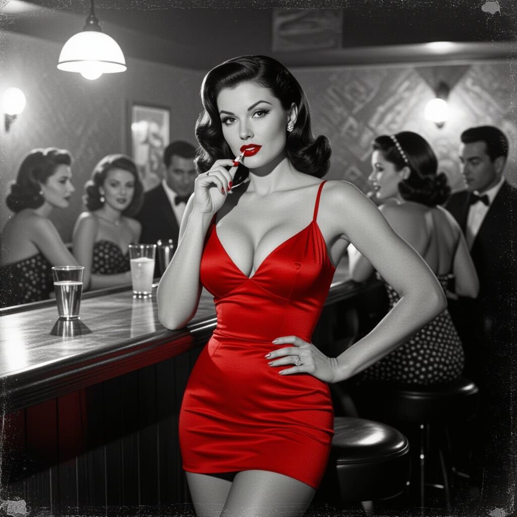 A retro-style image of a superhero housewife at a bar. This picture evokes a 1990s aesthetic with pin-up art elements and grainy texture, reminiscent of vintage vinyl covers and a monochrome palette.