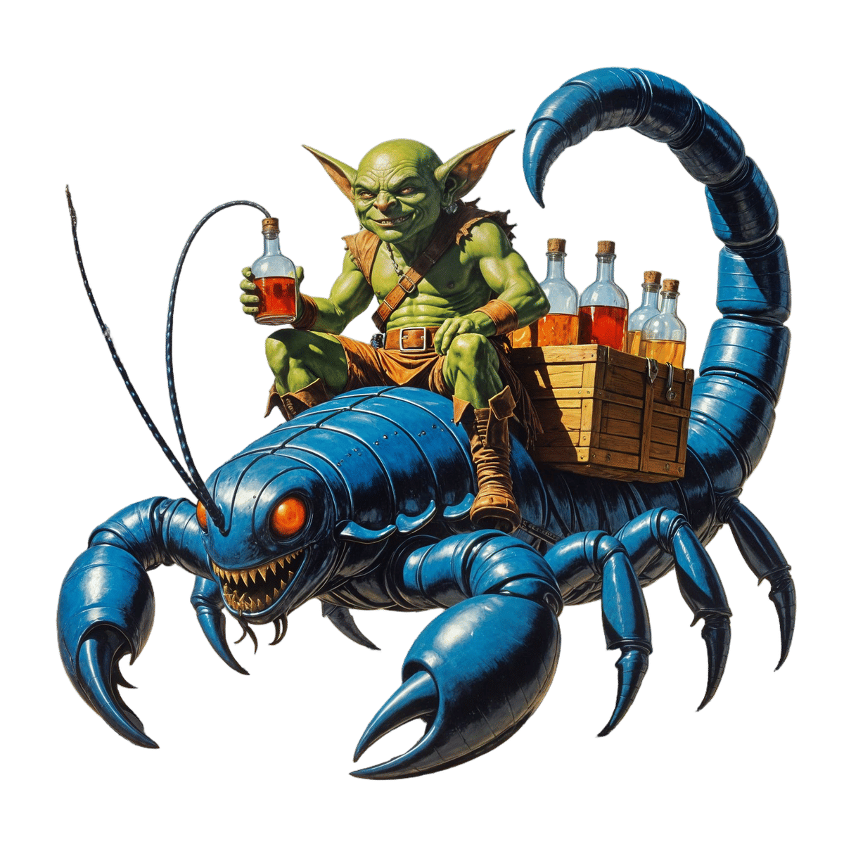 This image shows a comical goblin charlatan riding a giant blue scorpion pulling a cart filled with flasks. The artwork is reminiscent of vintage fantasy book covers, with a dark fantasy aesthetic.