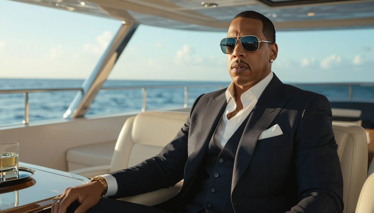 A striking picture of Jay-Z in a tailored suit on a yacht. The image captures a sense of luxury and wealth, reminiscent of high-fashion photography with detailed textures and lighting.