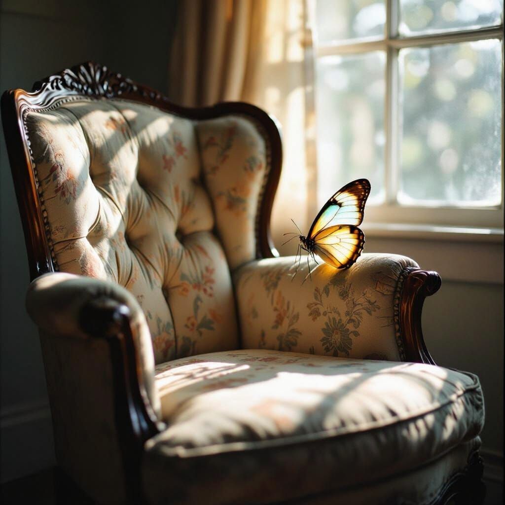 This film photograph captures a vintage armchair bathed in soft, natural light. A large butterfly with a gentle glow rests on the armrest, creating a scene of peaceful nostalgia. Shot with a shallow depth of field and film grain for a cinematic feel.
