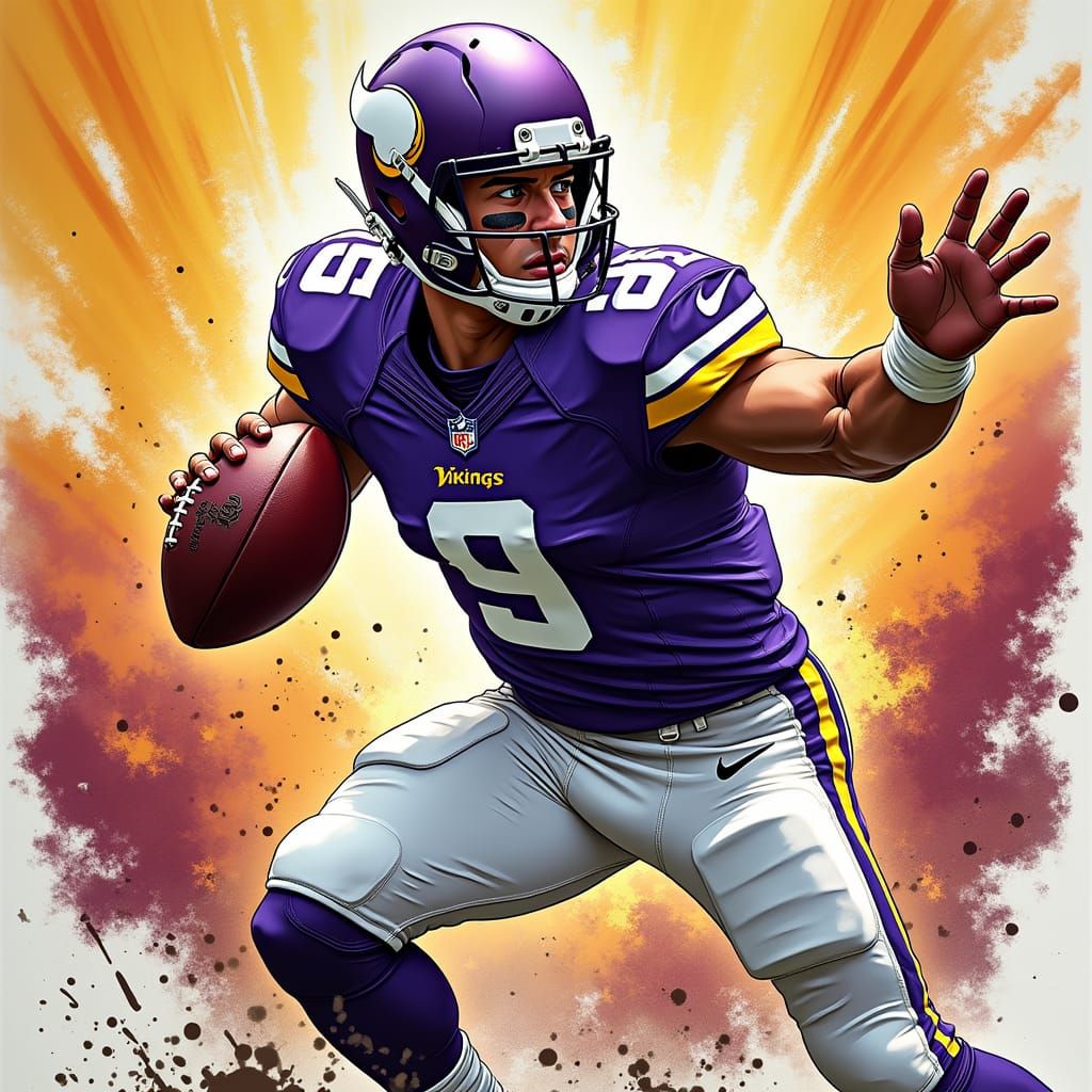 This image is a dynamic comic book illustration of a football quarterback in a bold purple and gold uniform, surrounded by explosive motion lines and colorful graphics, evoking the energetic style of classic Marvel and DC Comics.