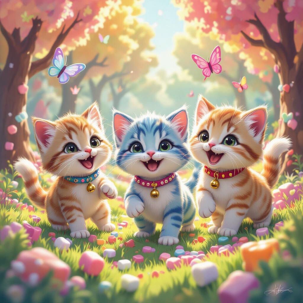 This image shows rainbow kittens with bells playing in a candy forest. The scene blends bright colors, adorable character designs, and whimsical animation to create a fantasy world.